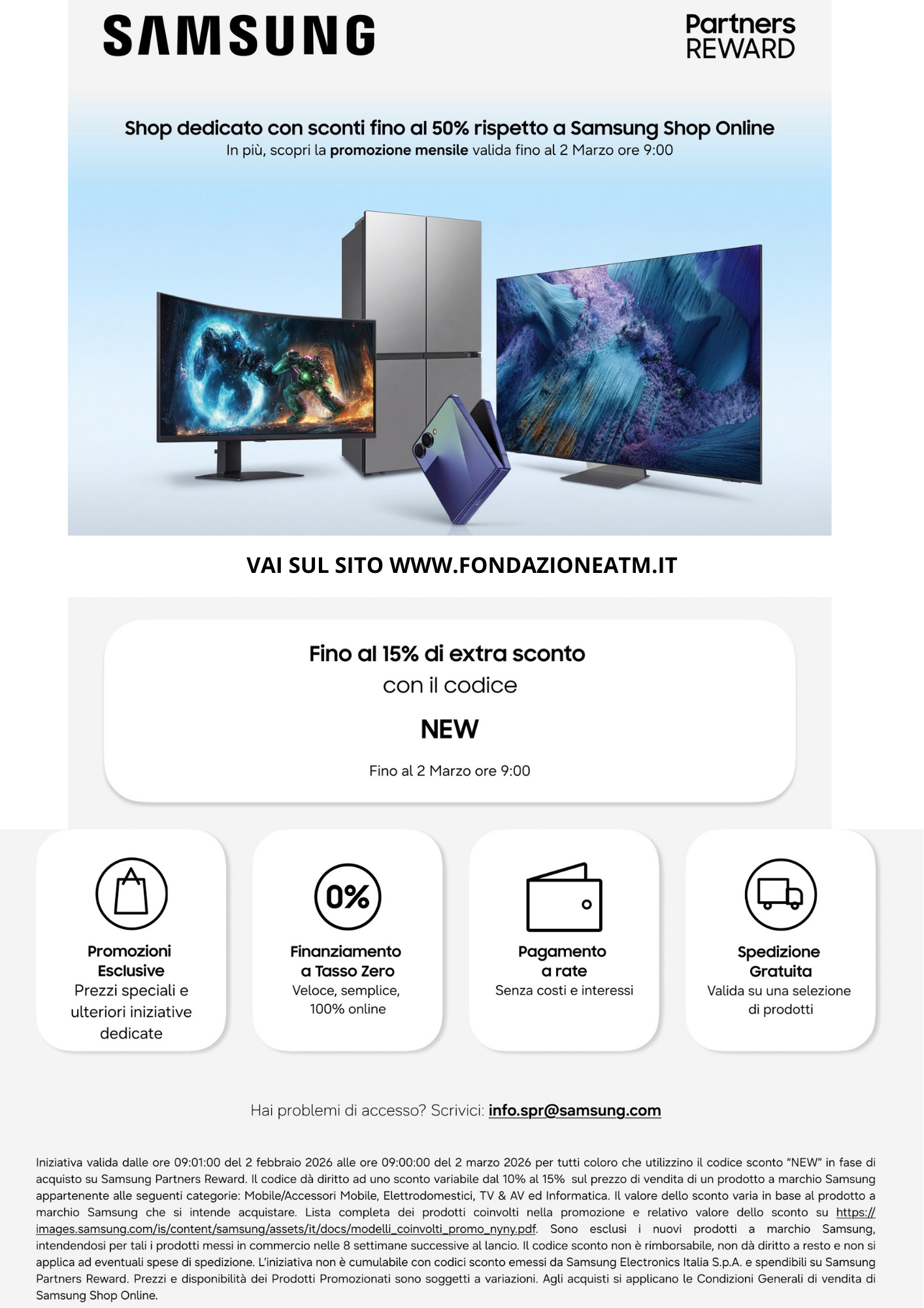 La convenzione offre una serie di proposte online di prodotti Samsung sul sito dedicato SAMSUNG PARTNERS REWARD a prezzi e condizioni particolarmente vantaggiosi, riservati ai Beneficiari di Fondazione e ai loro famigliari.